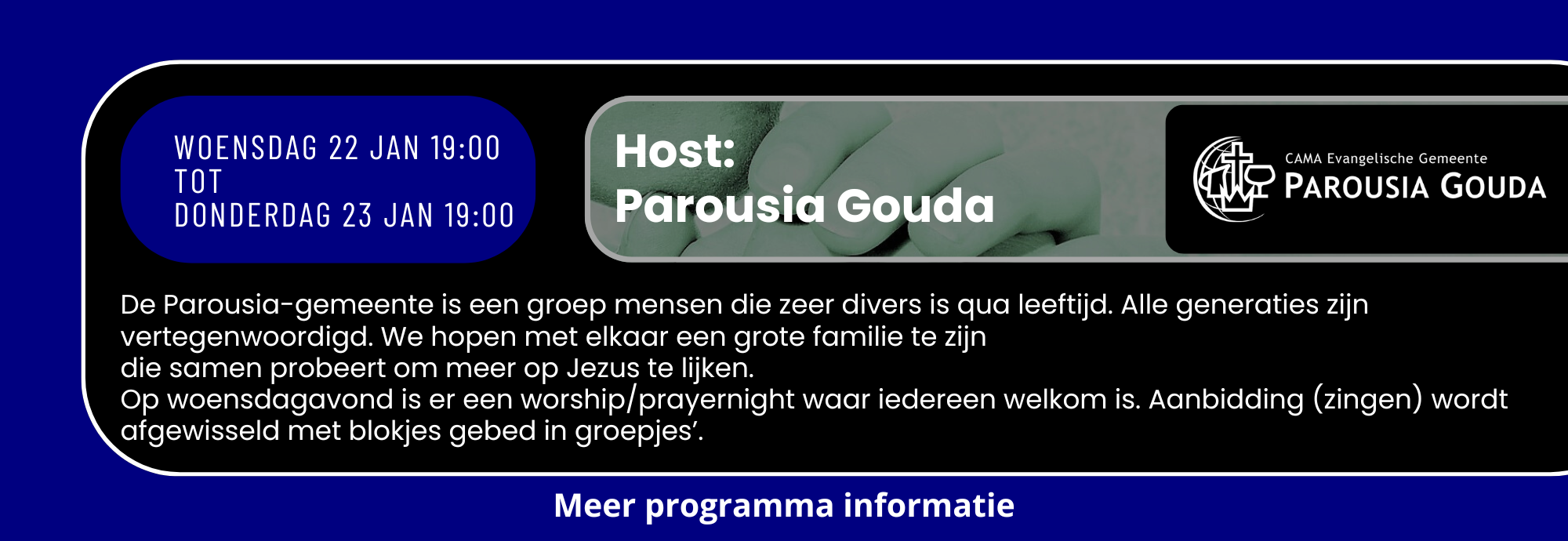 Je bent van harte welkom om te komen kijken bij je eigen gemeente of vereniging, maar ook bij de andere deelnemers. Zo zoeken we elkaar op en staan we samen in gebed.